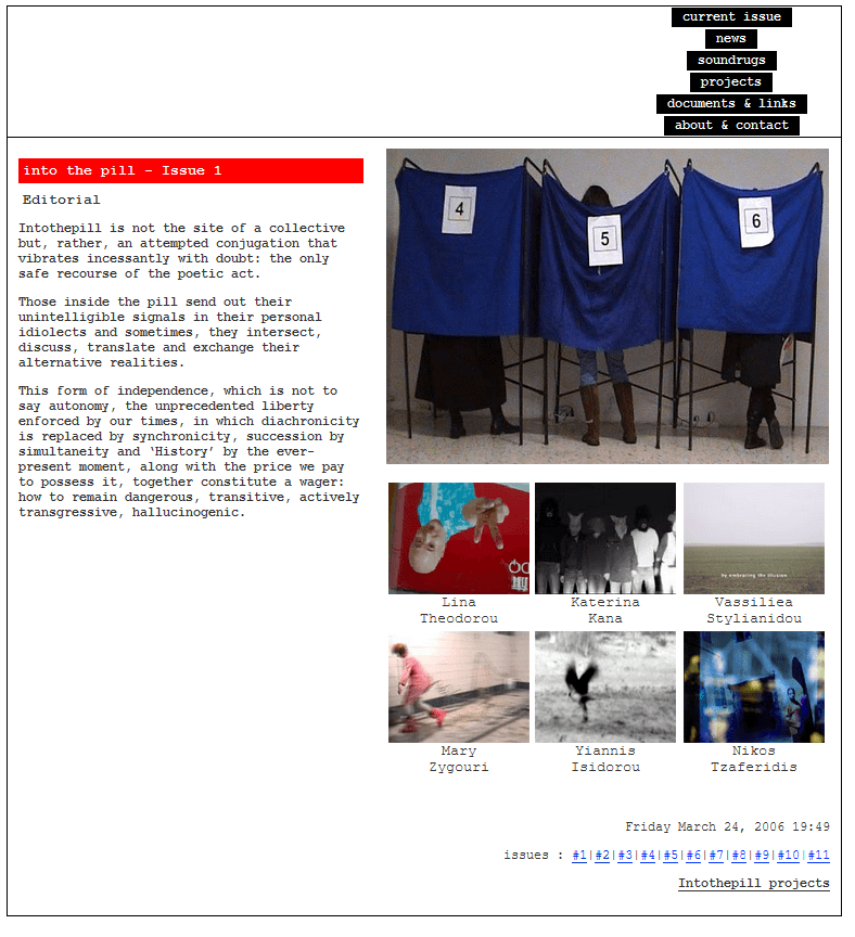 intothepill.net functioned as an early artist-run platform for experimental moving image, digital collaboration, and collective writing. It hosted video works, theoretical fragments, and city-based experiments, creating one of the first informal networks of contemporary media production in Athens.